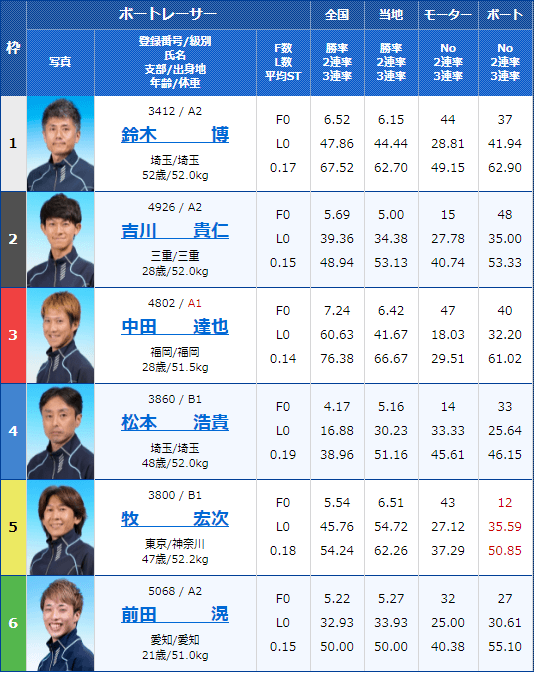 A2級選手の1号艇・鈴木博選手、6号艇・前田滉選手、そしてA1級選手の3号艇・中田達也選手に注目した買い目だ。