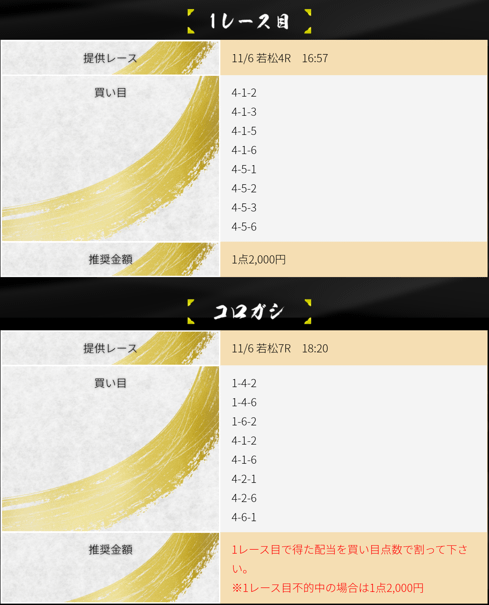 11月6日「登竜門(夜)」の提供予想は、若松4R→若松7Rの2レースコロガシとなっていて、提供された買い目は画像の通りだ。