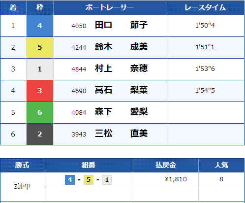 また、5号艇は競艇ファンなら誰もが知っているA1田口節子選手が入りこちらも人気を集めていました。