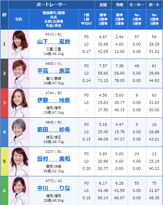 - 【6号艇】:内山 七海選手(B1/福岡)