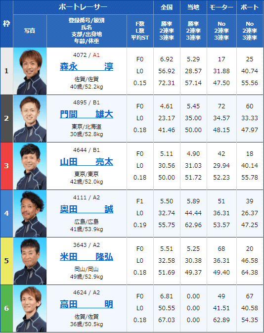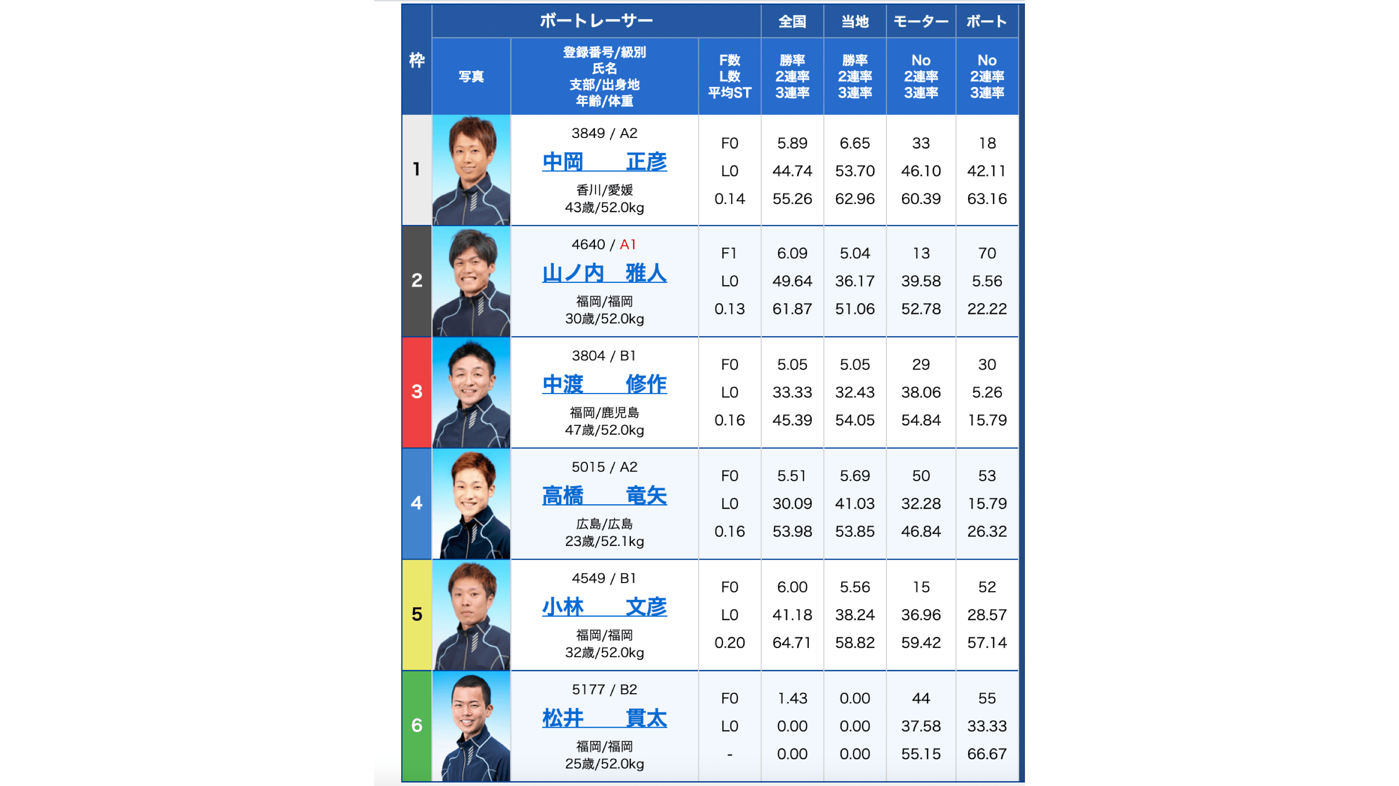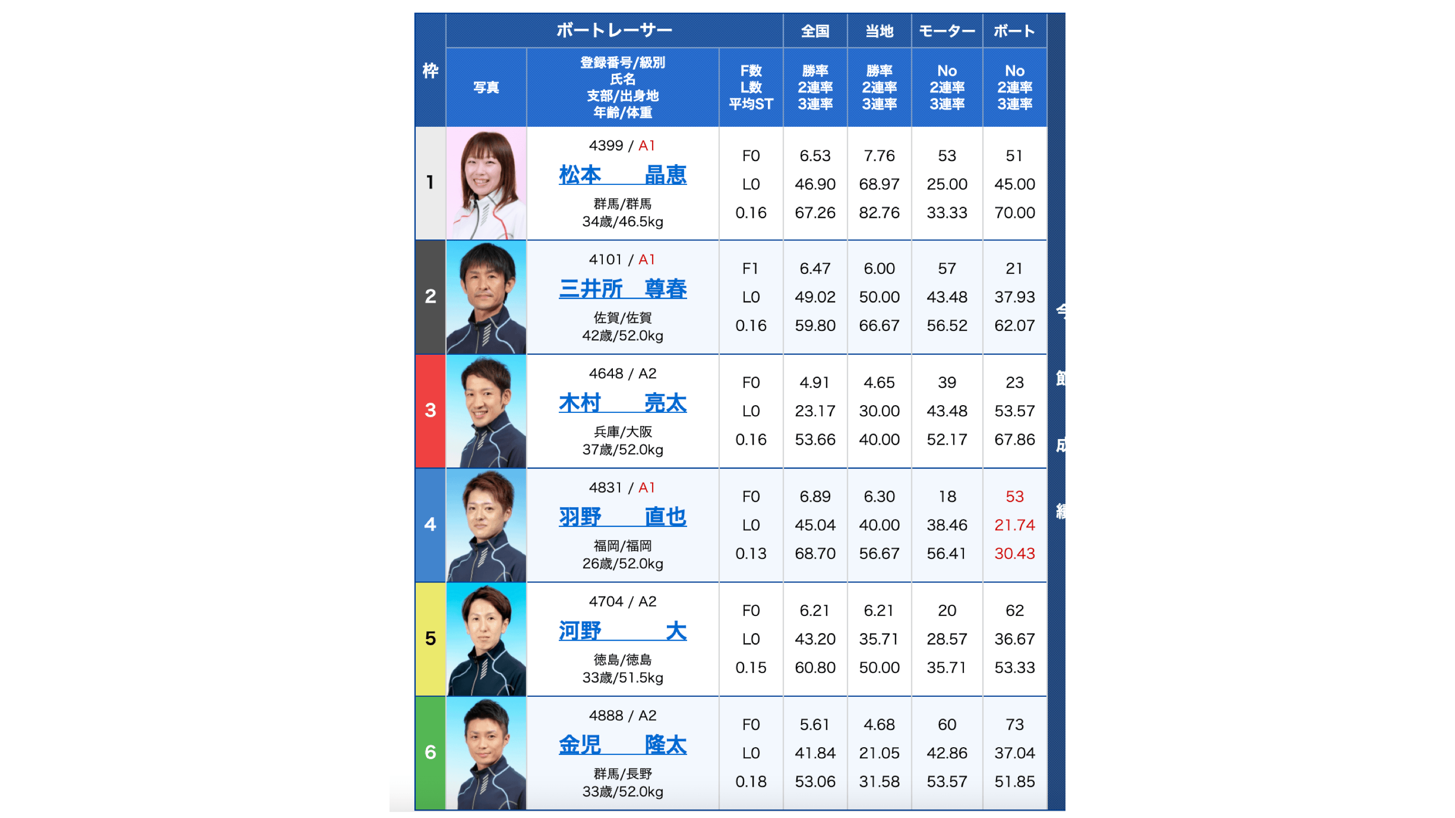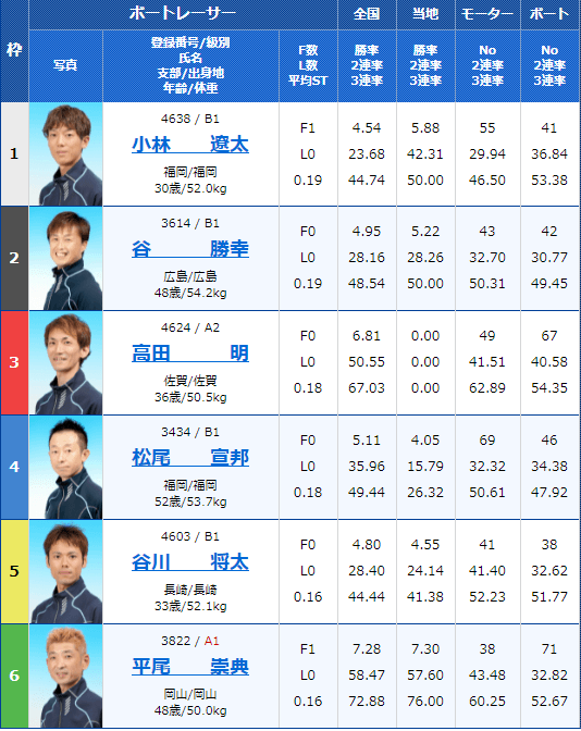 また、全国・当地勝率は6号艇選手も高いことが特徴ですね。