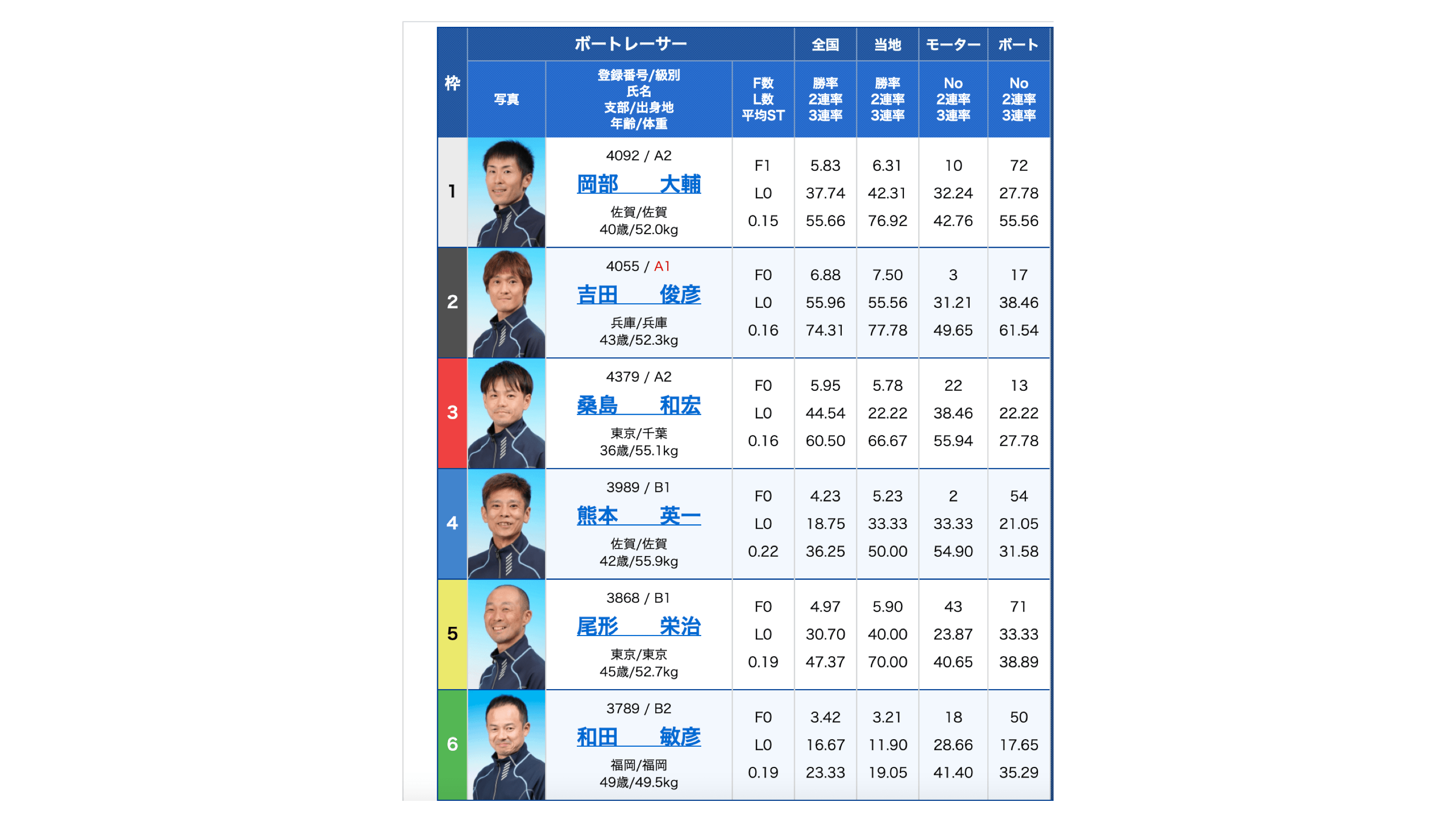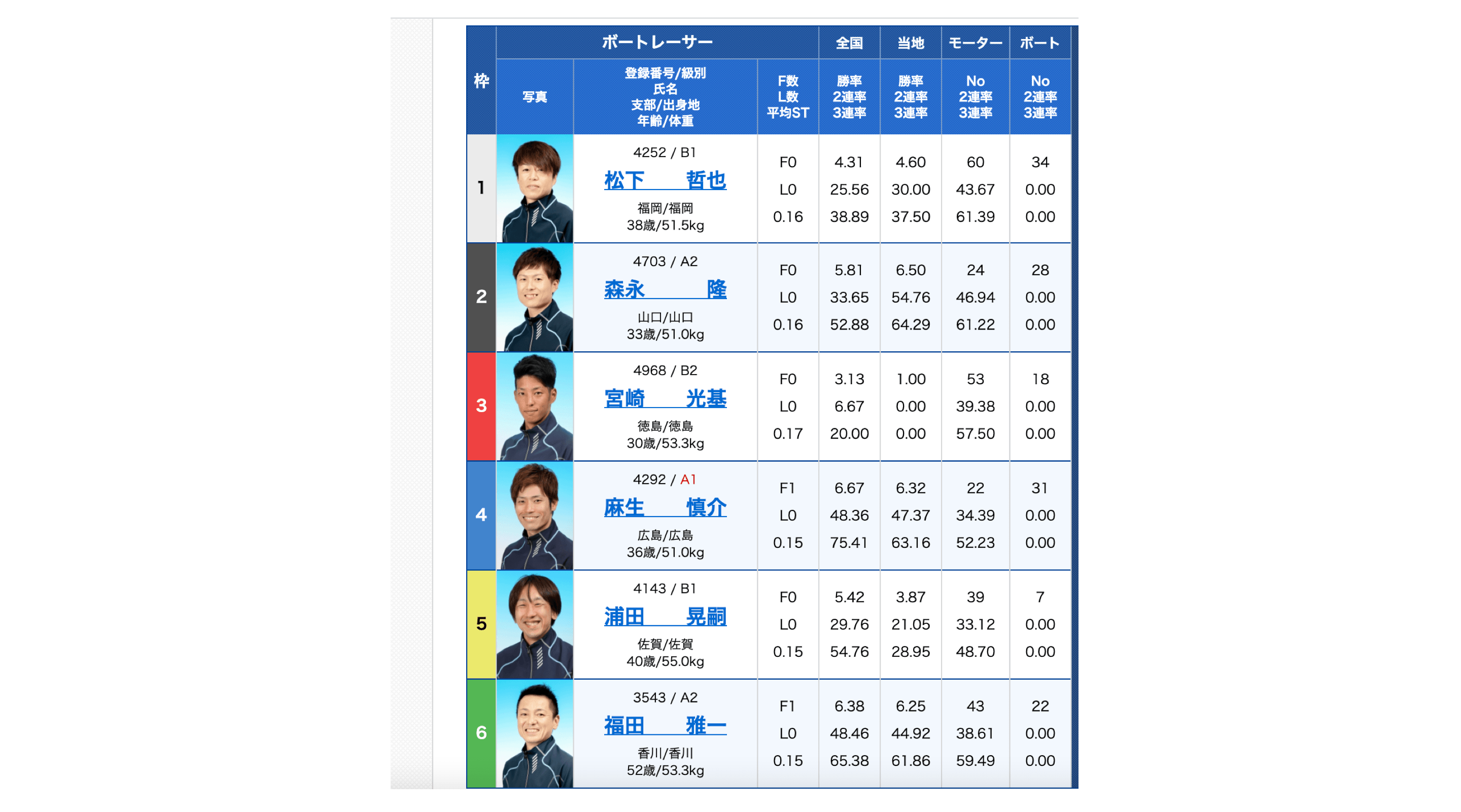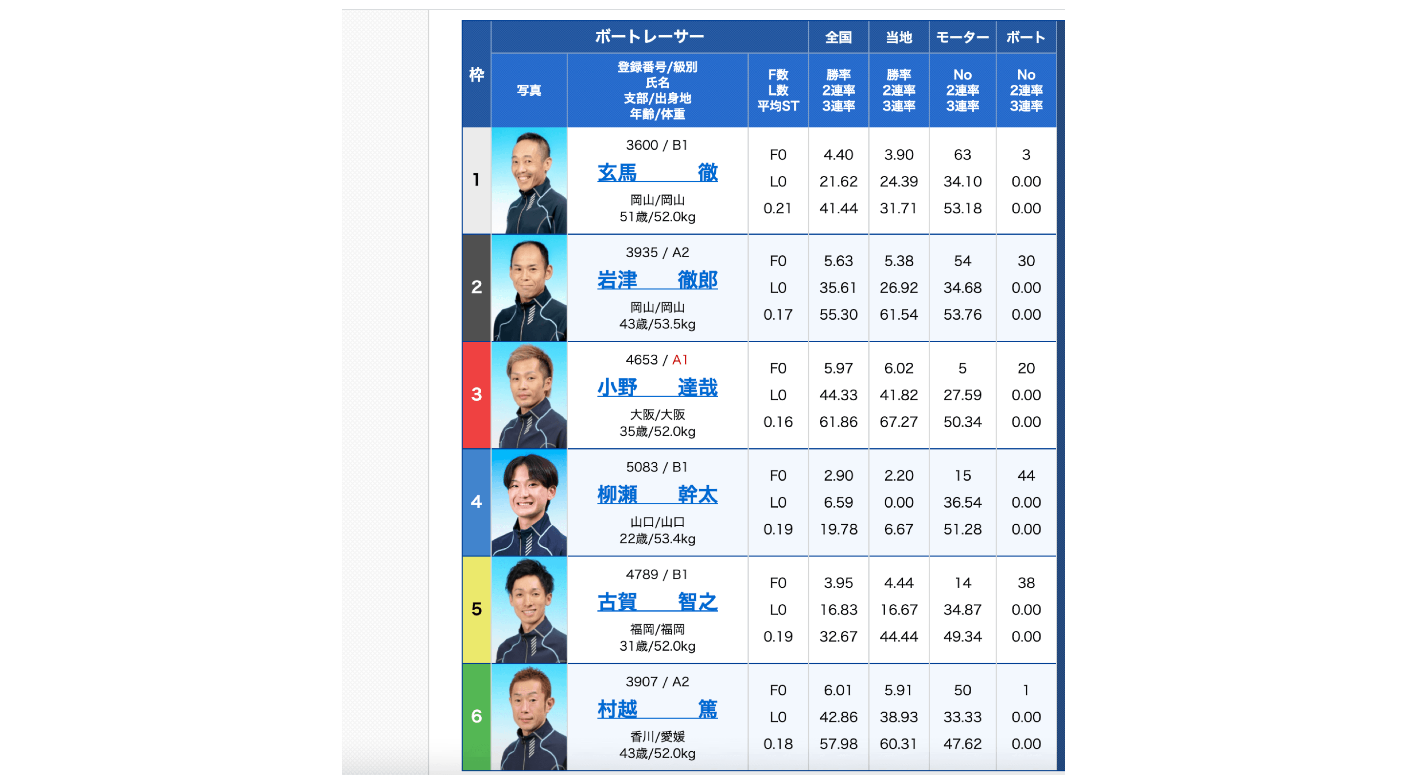 また、全国・当地勝率は6号艇選手も高いことが特徴ですね。