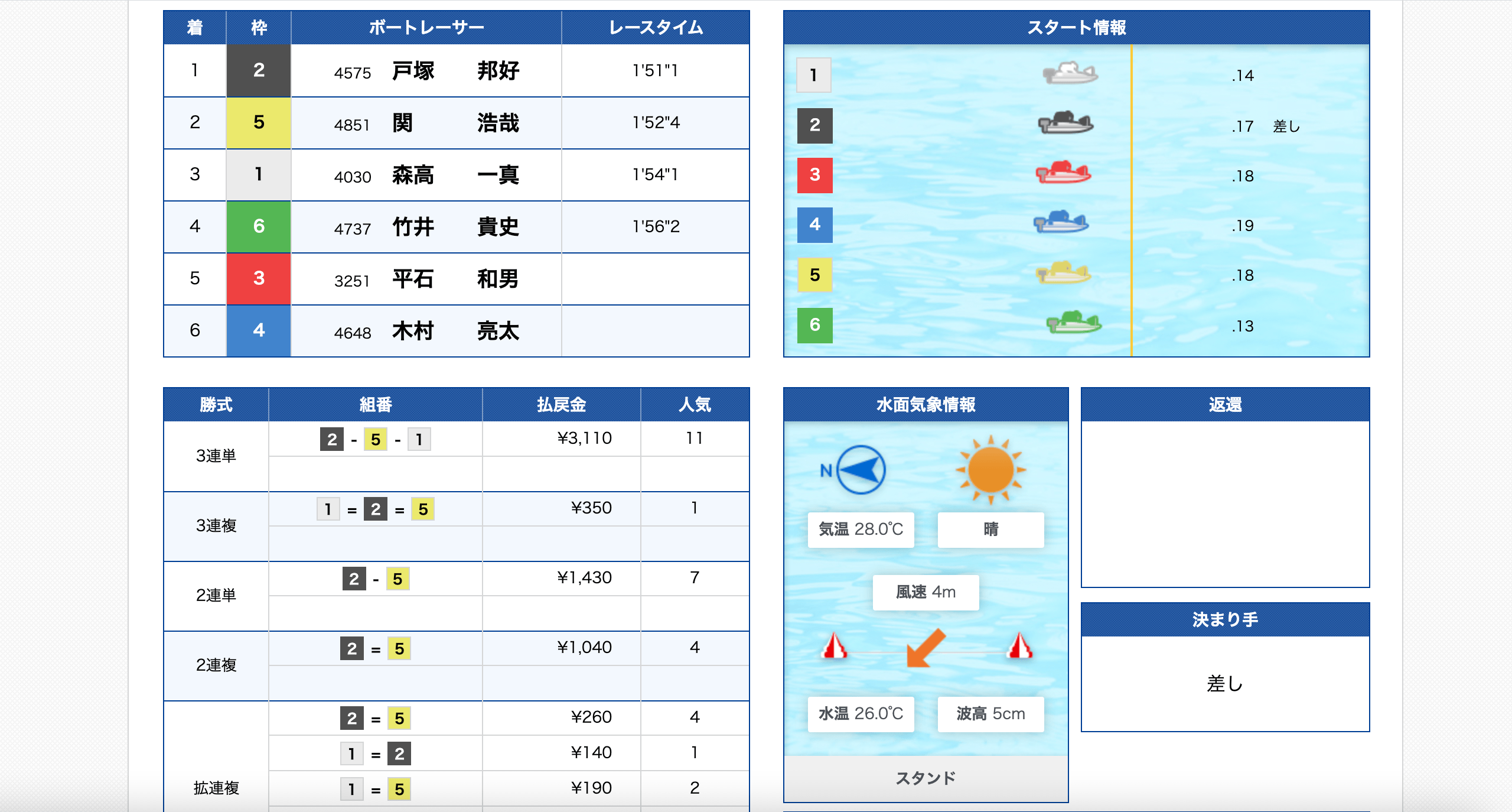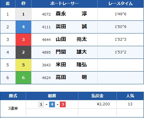 2号艇は現在までの勝率も安定しているため、2号艇1着になる可能性が高いでしょう。