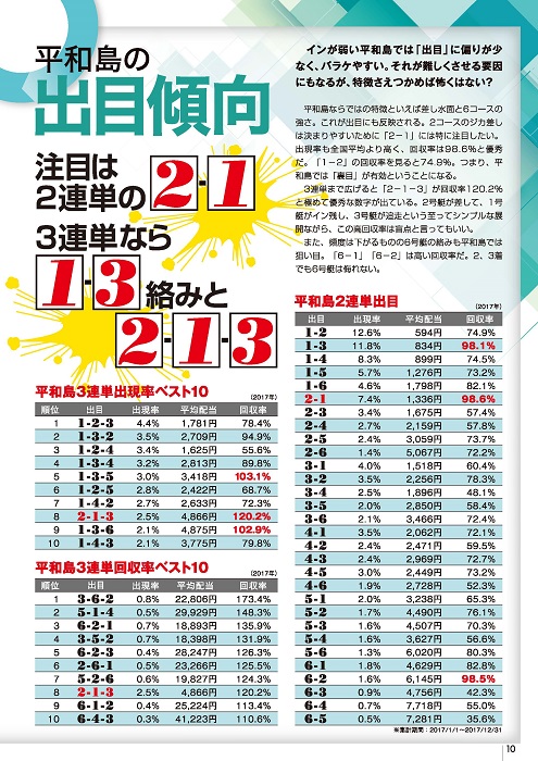 ボートレース平和島は差し有利な水面であるため、「2-1」など2着に1コースが絡む出目の出現率が高い傾向にあります。