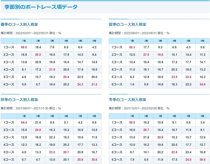 ボートレースでは通常、気温が下がりモーターがパワーアップしやすい冬場はインが有利、反対に、気温が上がりモーターの調子が出ない時はアウトコース有利がセオリーとなっています。