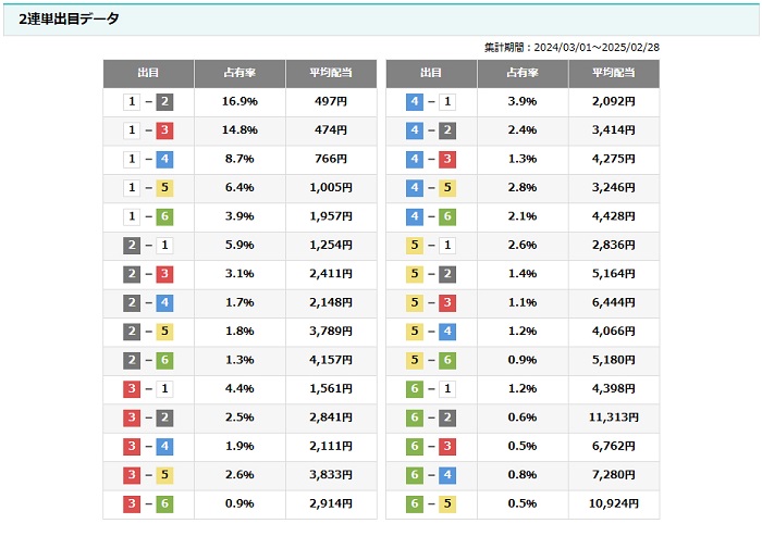 桐生競艇場の公式サイトでは2連単の出目データや季節別の出目データが見られるガブ!