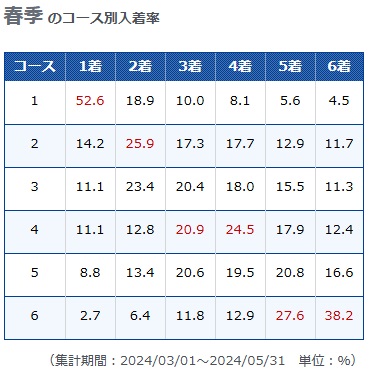 2コースは差し、4コースはまくり、5コースはまくり差しの発生率が高くなっています。