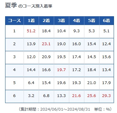 - 1コースの1着率は52.1%、全24場中20位と悪い成績