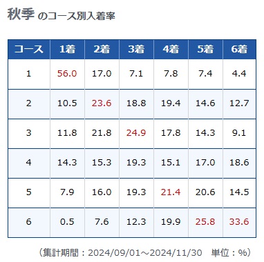 2コースから4コースまでの1着率がとにかく高くなり、まくりでもまくり差しでも戦える3コースは1着率が1年間で最も高くなります!