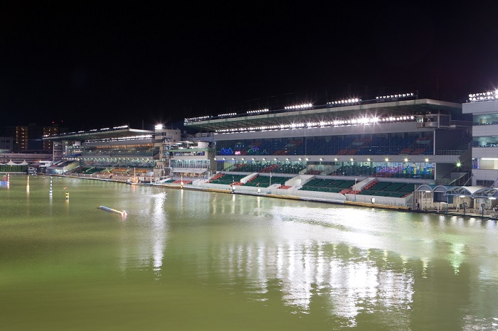 一方で、水質は工業用水を利用した「淡水」となっているため、水面は非常に硬くボートが跳ねやすいという特徴も。