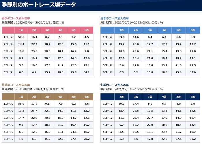 | コース | 勝率 | 1着率 | 2連対率 | 3連対率 |