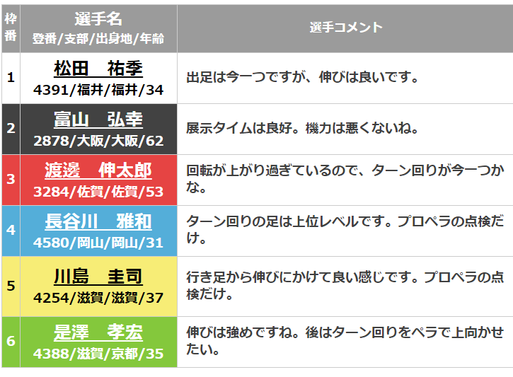 選手が自身のモーターやスタートについて、本番のレース前にコメントをします。