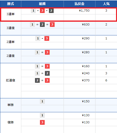 画像を見ていただくと分かりやすいですが、左から順に1着、2着、3着となっており、これは公営ギャンブル共通の考えた方なので、覚えておいたほうが良いですね。
