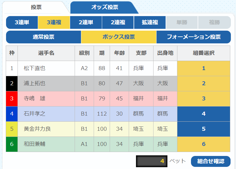 - 3連複ボックスとは3連複で選んだ艇全ての組み合わせの買い目を買うこと