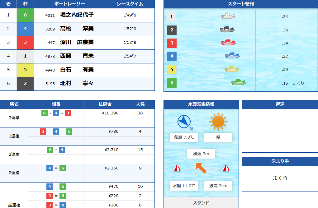 ここは6枠の堀之内選手を軸にスタートの調子の良い3枠深川選手と当地勝率の高い4枠高橋選手に賭けてみましょう。
