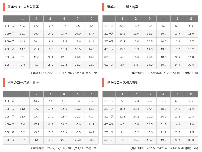 競艇場にもよりますが、1コースの1着率は夏と冬では5~10%ほど変化することもあります。