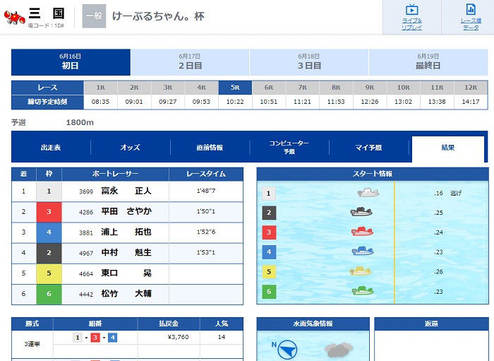 画像のレースはこの日の三国5R、2号艇が唯一のA1選手で人気を集めていたものの、結果は「1-3-4」。