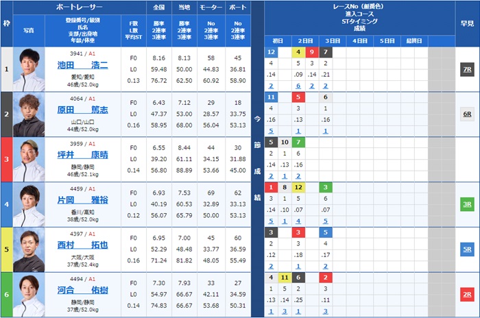 とくに公式でも見ることができる出走表からは、選手の当地での勝率や引いたモーターの性能、そしてその節での調子などを確認することが可能です。