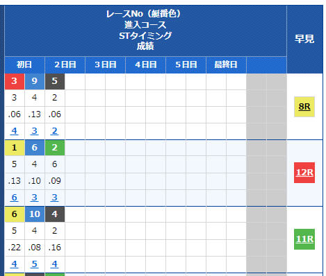 1号艇での出走をしていても1着を取れていないことが続いていたり、逆にセンター・アウトのコースでもしっかりと着順上位に食い込めていたりといったことが分かります。
