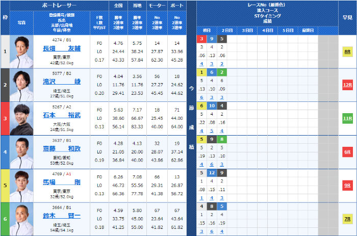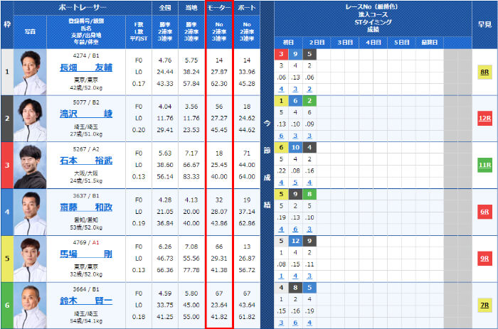 1コースなど強いコースにA1級選手がいたりする際は買いの対象になったりするので、結構大切な項目です。