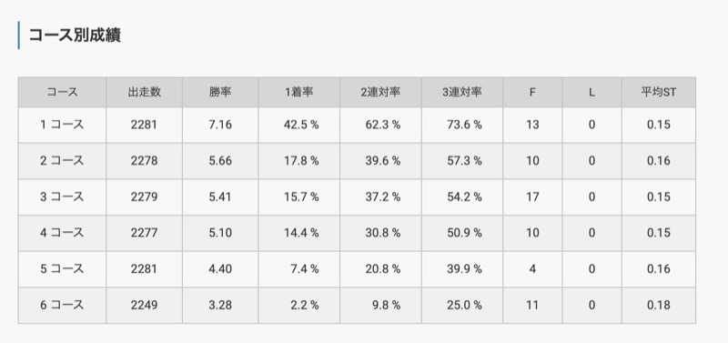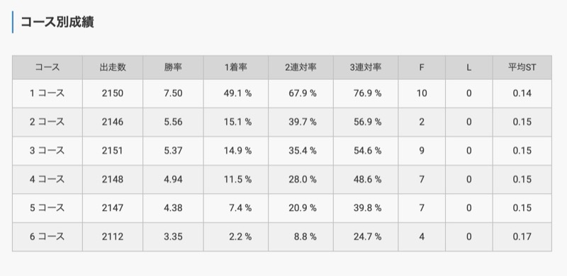2コースや5コースの1着率も高いため、予想の際は選手の成績やモーターのデータを確認する必要があります。