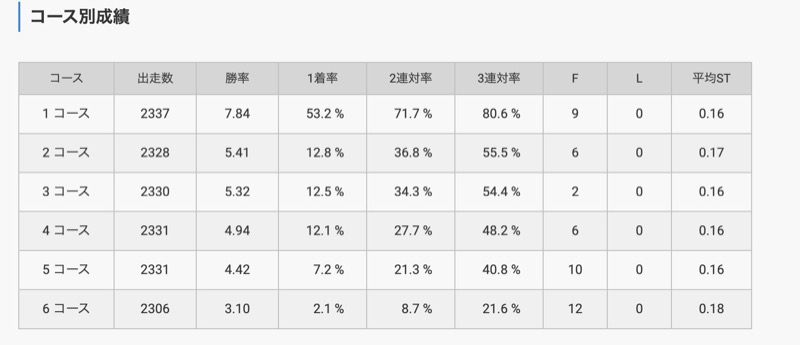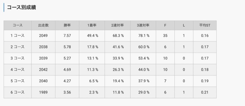 コース別成績を細かく確認すると、4コースから6コースの2連対率が高いため、アウトコースはほかの会場よりも舟券に絡む可能性があるでしょう。