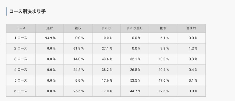注目したいのは勝率が高い3コース・4コースの決まり手で、どちらのコースもまくりが決まる確率が高いことがわかります。