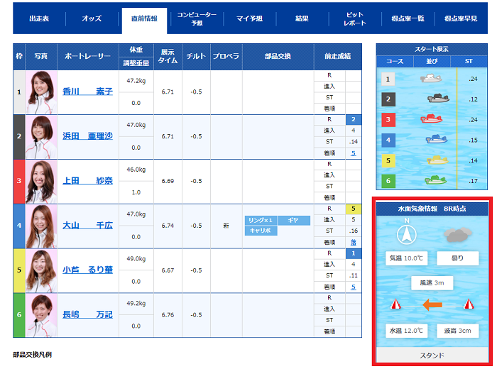 風の情報は展示航走終了後にBOATRACE公式サイトの直前情報で公開されます。
