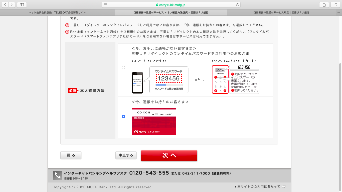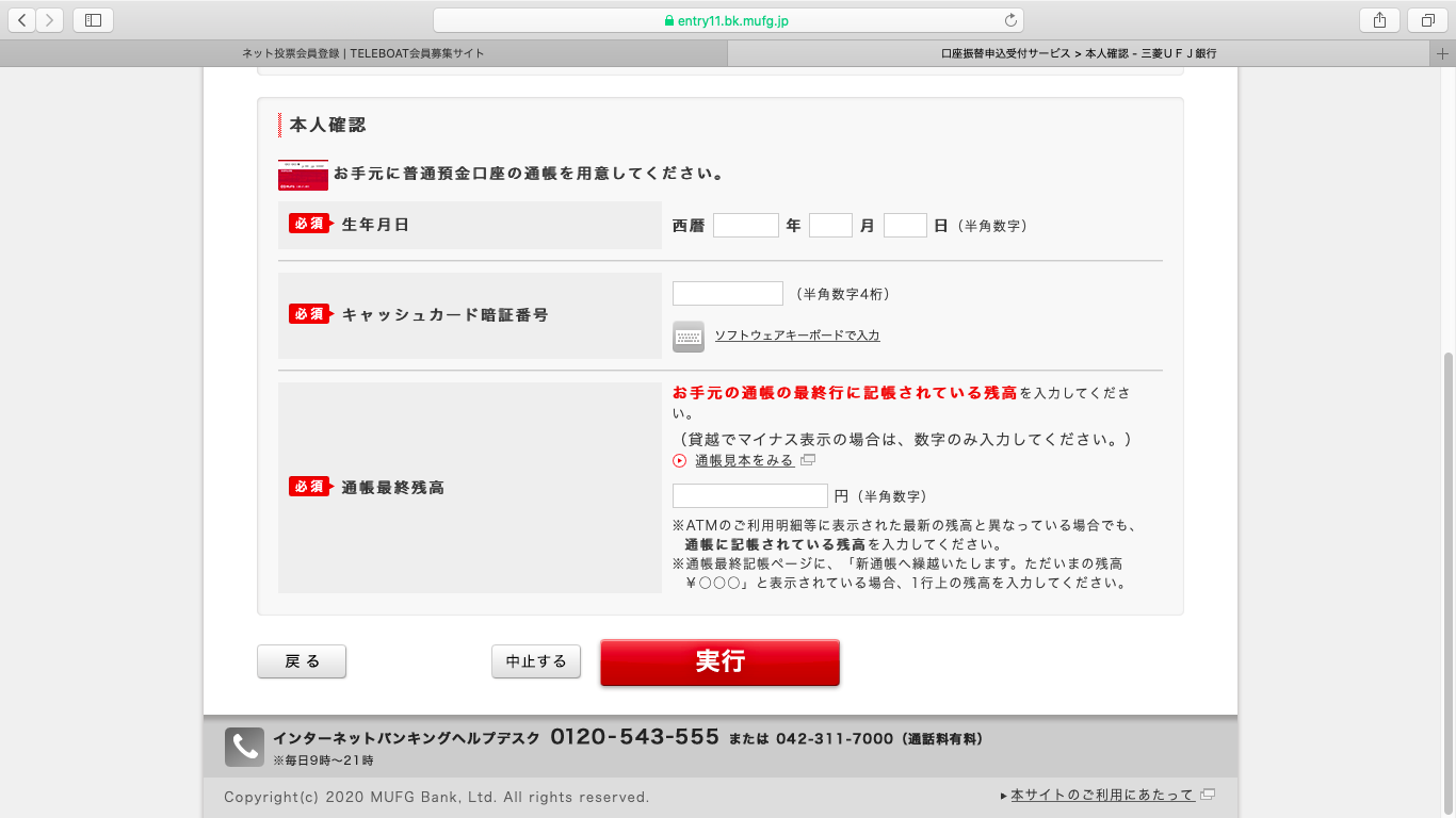 三菱UFJ銀行の場合は「生年月日」「キャッシュカード暗証番号」「通帳最終残高」 の入力が必要(通帳が手元にない場合は三菱UFJダイレクトワンタイムパスワードでもOK)でした。