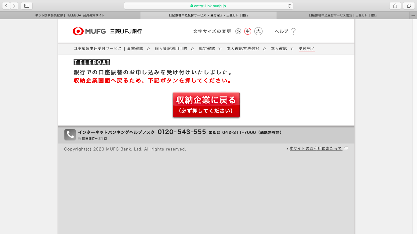 ここからは自動的に各銀行の口座振替契約の申し込みページへ移動しますので、 それぞれの銀行が指定する方法に従って手続きを進めてください。