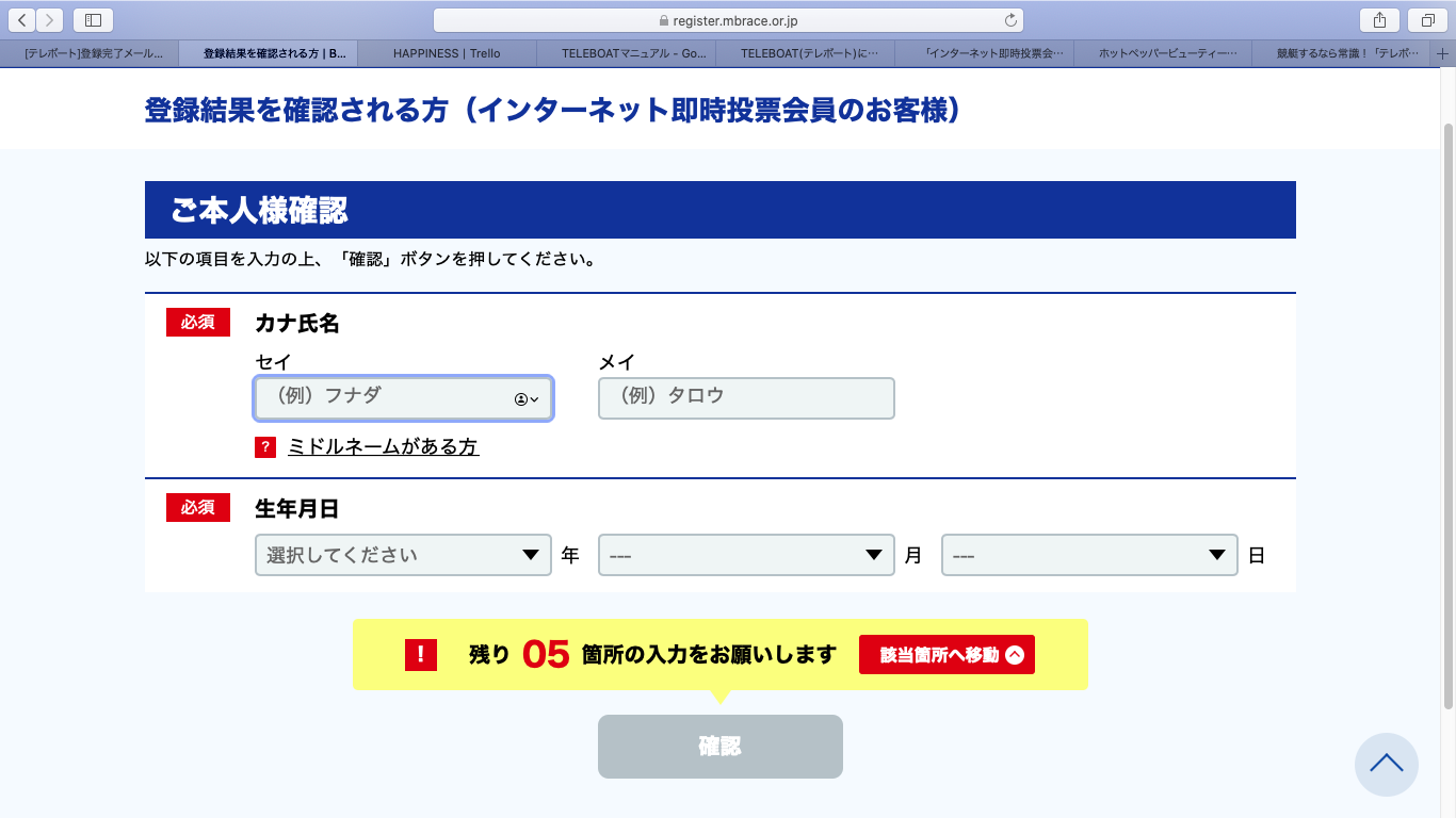 氏名(カタカナ)と支店番号(3ケタ)、口座番号を入力し(7ケタ)、 生年月日をプルダウンメニューから選択して「入力内容の確認」を押します。