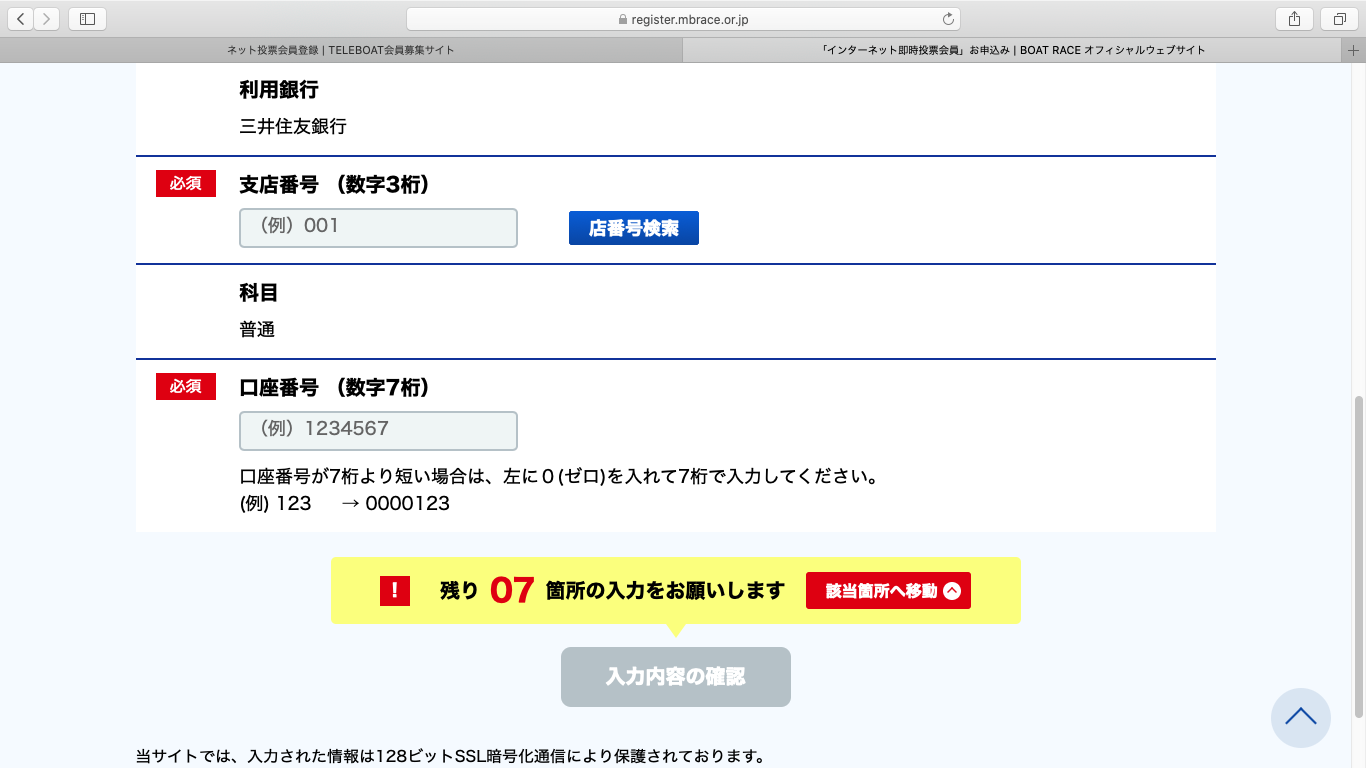 - 1.口座確認情報(氏名・生年月日・支店番号・口座番号)を入力、送信