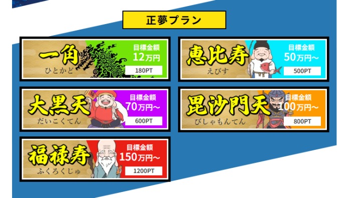 慎重な人は日替わりプランから始めて、ここぞという勝負時には福禄寿などの最高峰プランに挑んでみるなど、楽しみ方が膨らむサイトになっているようです。