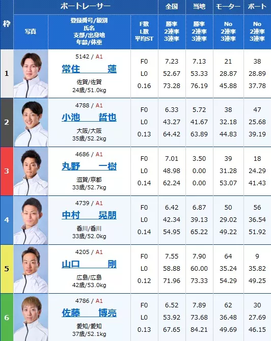 丸野一樹も勝率と平均ST、3号艇という位置取りを考えるとバランスがいいですね。