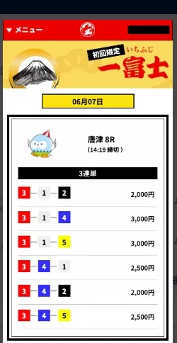 | 一富士 | 3連単 2レース | 3~10点 | 15,000円 | 35万円~ | 250PT | 不的中ならPT返還 初回限定 |