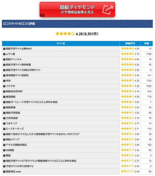 競艇予想サイトを知る際はさまざまな検証サイトの口コミ評価を見るのは非常に大切なことですが、競艇ダイヤモンドはどの検証サイトの口コミを見ても、基本評価が高い!