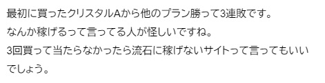 最初に買ったクリスタルAから他のプラン買って3連敗です。