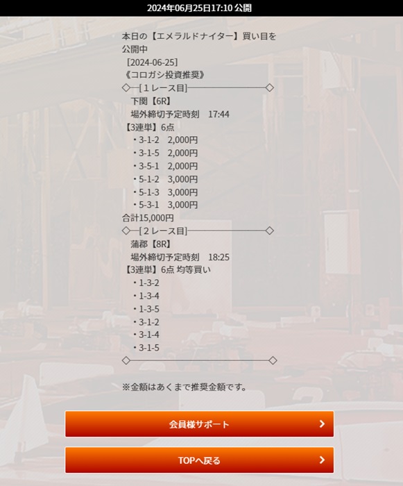 予想師はC〜Sランクの4段階にランク分けされてランク別に調査予算比率が設けられており、予想師達の情報を独自のノウハウでかけ合わせて買い目情報を作り上げているとのことです。