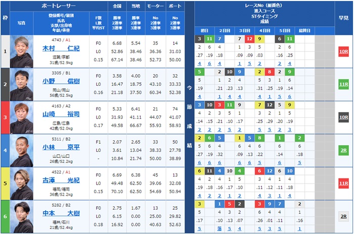 1号艇にはA1木村仁紀、3号艇はA2山崎裕司、5号艇は古澤光紀と奇数艇に強い選手が入るレースとなっています。