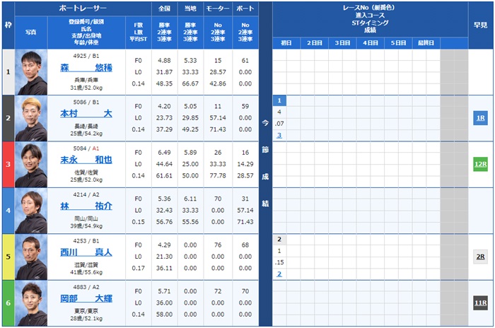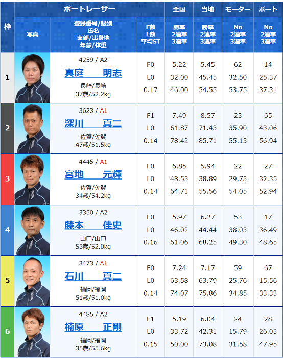 反対に、2,4,6号艇は新人選手など実力で見るとちょっと劣る選手が入っていますね。