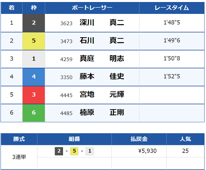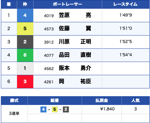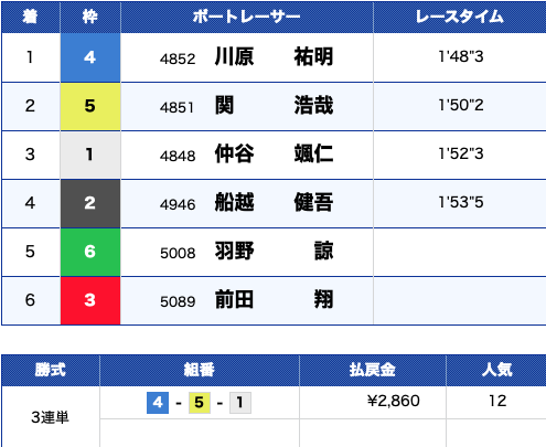 堅めの予想とは言えちょっとドキドキしましたが、4号艇の川原祐明選手がまくりを決めて見事的中となりました。