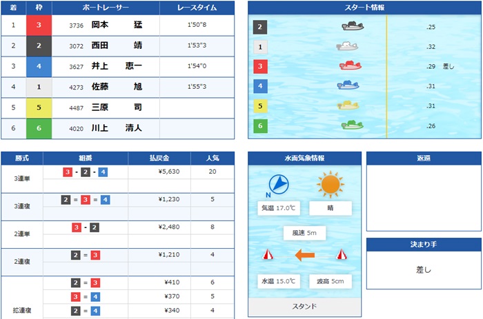 1号艇佐藤選手がジカまくりにいったところを3号艇岡本選手の差しが決まり1着に!