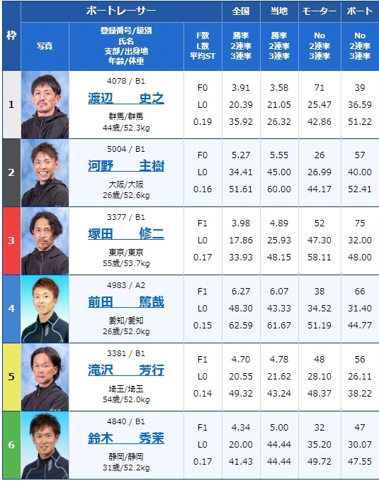 オールB1選手と決め手に欠けそうなこのレース、1号艇佐藤旭選手は勝率こそメンバー内1位ではあるものの、3走して全て着外と調子が悪そうな印象です。