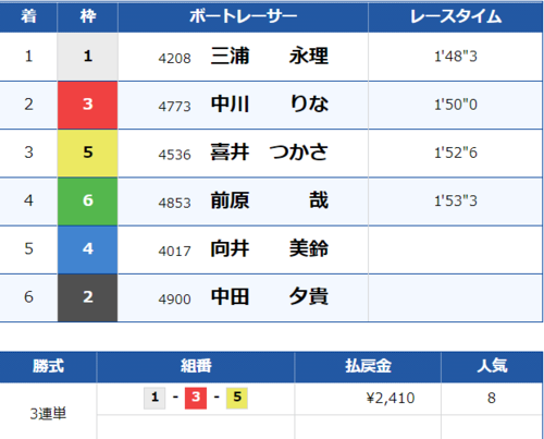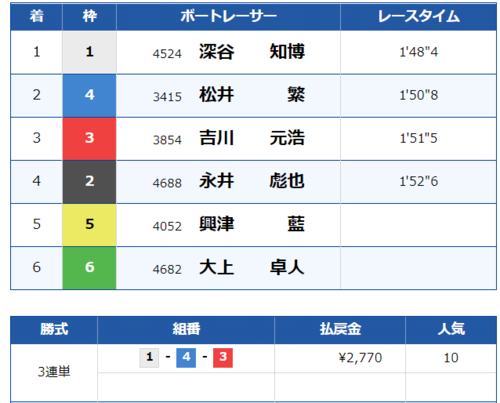 特大万舟かと思いましたが、道中争いでA2の2選手がしっかり逆転、そのまま1号艇鈴木選手も3着の競り合いを制し的中!