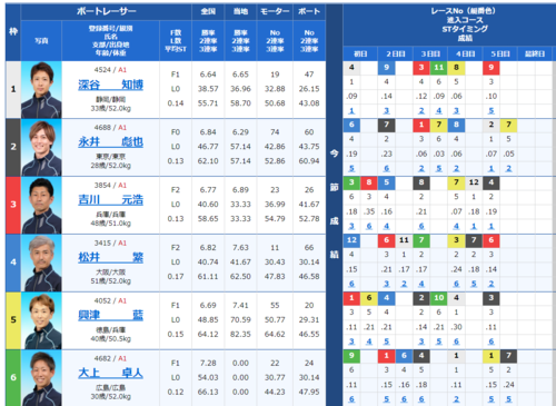 1号艇から3号艇の3選手の勝率が高めでインコース決着になりそうですが、6号艇竹井貴史選手が7レース中5レースで1着とかなり良さそうで、どう絡めて買うかが難しいレースですね。