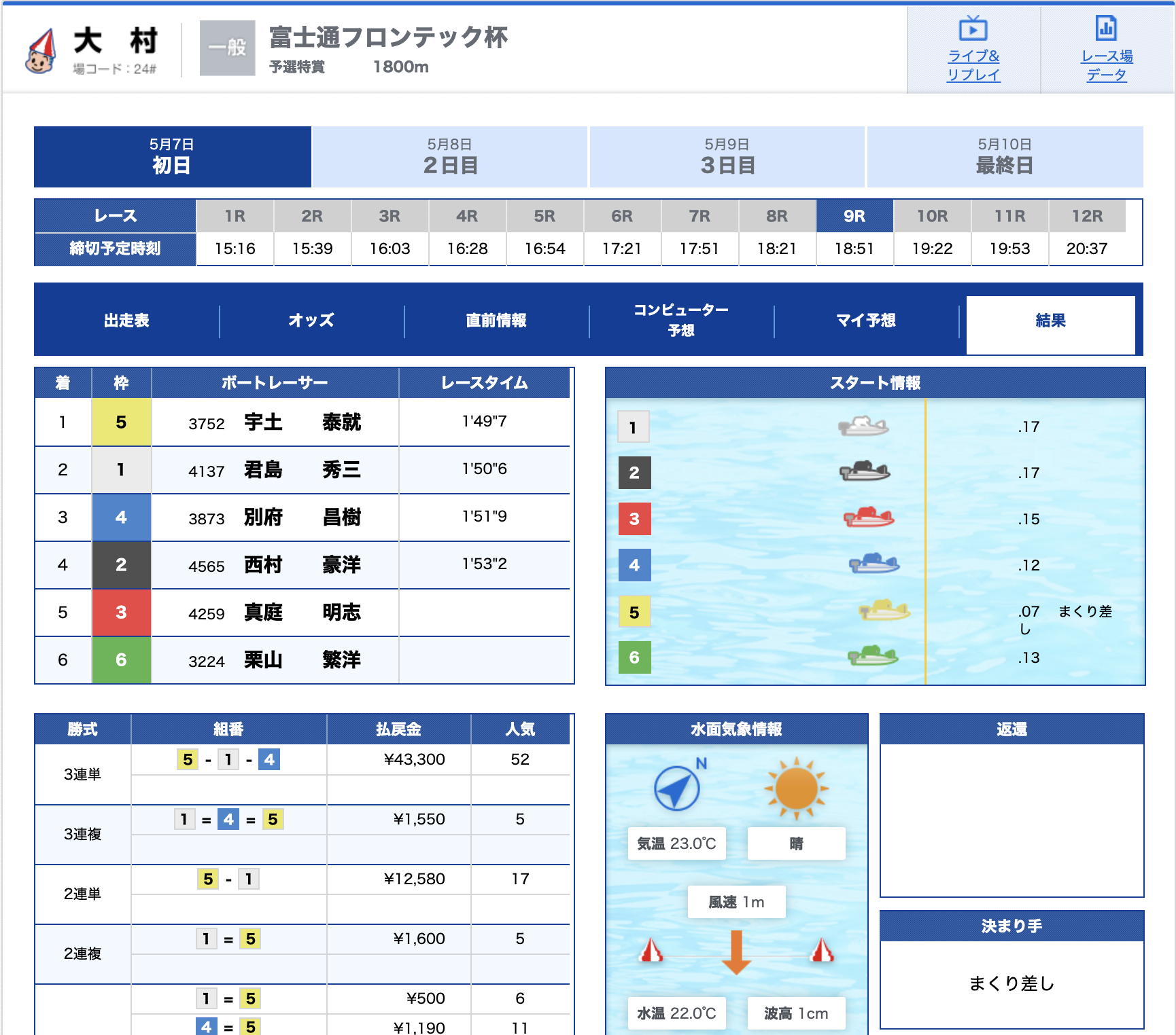 - 【5号艇】:竹田 和哉選手(A1/香川)