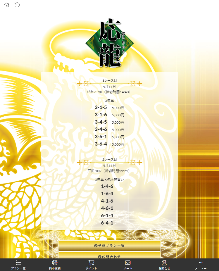 「皇艇」の担当スタッフの方に5月11日のオススメの上級予想プランを聞いてみたところ、「応龍」を勧められました。